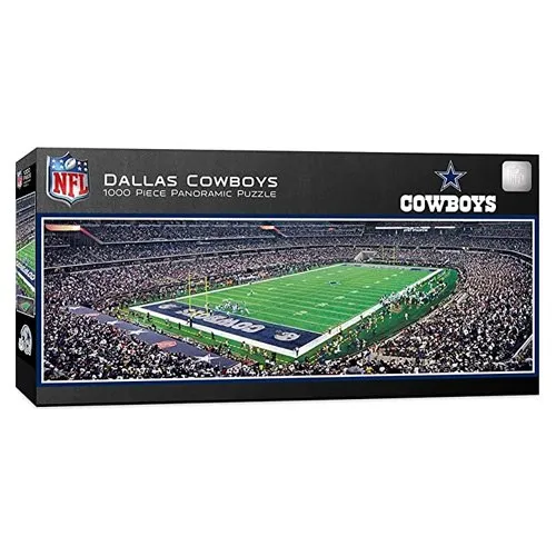 This officially licensed NFL product is a must-have for any football fan! The 1000-piece puzzle features a detailed panoramic view of the AT&T Stadium and is perfect for framing when assembled. With thick recycled puzzle board and random cut pieces, the puzzle is sure to provide hours of fun for ages 13 and up. Made of recycled cardboard, the puzzle measures 13” x 39” when assembled.