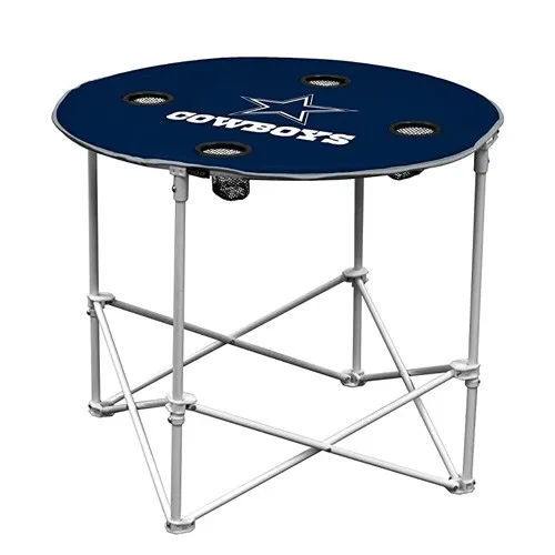 This portable table is made of 600 denier polyester and measures 30” in diameter and 24” tall. A perfect height for easy dining, this table also folds up for easy storage and transport. Features a large screen printed Dallas Cowboys logo and four cup holders on each side of the table. Ideal for outdoor parties or for taking when traveling to watch their team.