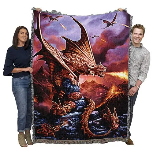 Made from sustainably-sourced American grown cotton farmed near the Blue Ridge Mountains, this is the throw blanket of any dragon fans dreams. Bearing the image of the Fire Dragon by Anne Stokes this super-soft, queen-sized, and machine-washable blanket allows anyone to cuddle up and stay cozy while being wrapped in fantasy in the truest sense.