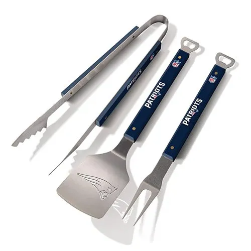 When it comes to grilling for Patriots games and other sporting events, nothing beats a quality 3-piece BBQ set. This set is made of heavy-duty stainless steel and hard maple handles, and features a laser-cut design. The team-colored composite handles are sturdy and brass rivets hold them together securely. The integrated bottle opener is convenient, as are the integrated grill tongs. Any fan who loves to grill and cheer on the Patriots will love this set.